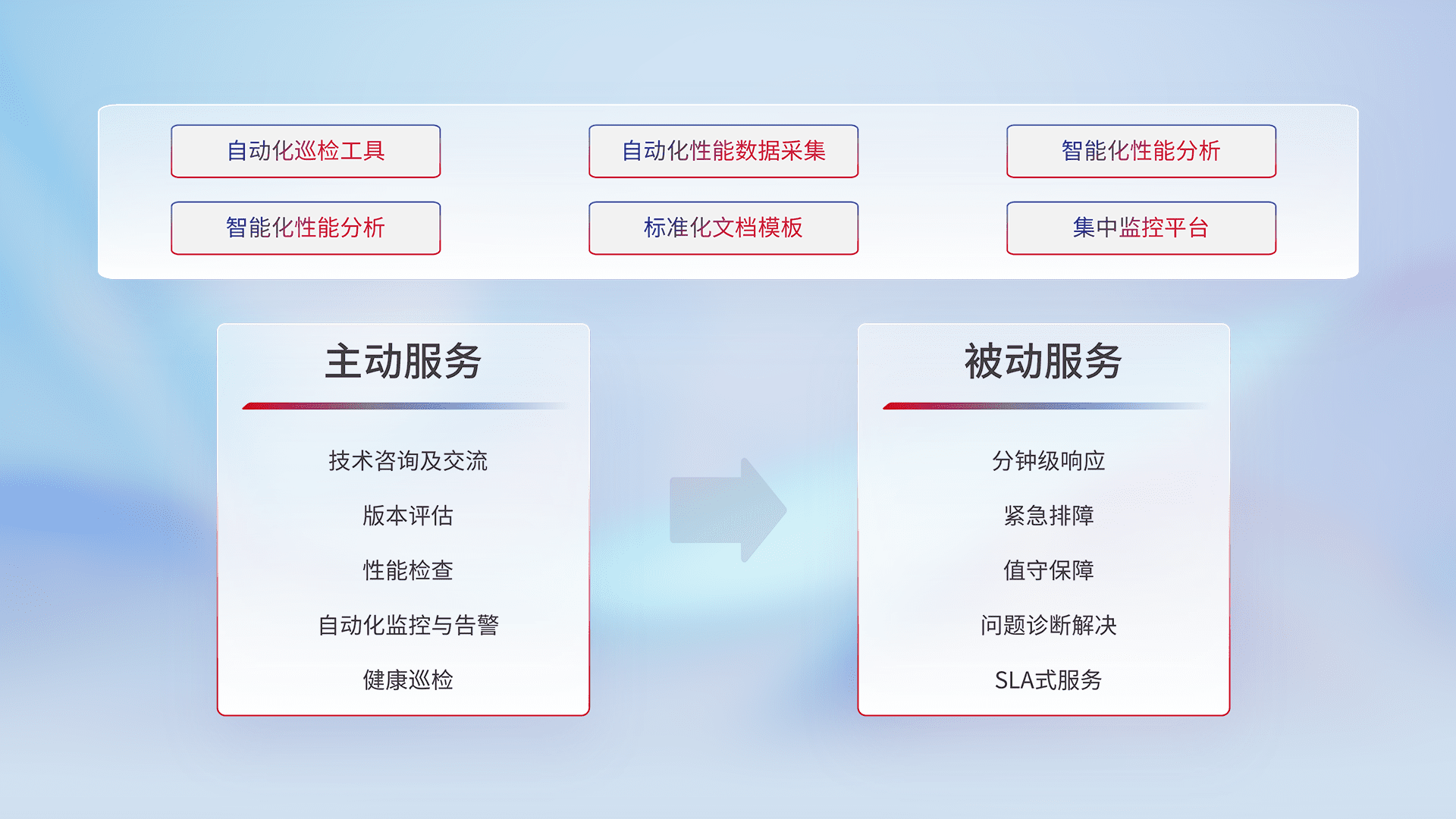 智能化工具和标准化文档,,保障服务质量,,提供主动服务(包含技术咨询、、、、版本评估、、、、性能检查、、、自动化监控与告警、、健康巡检)和被动服务包含(分钟级响应、、、、紧急排障、、、值守保障、、、问题诊断解决、、SLA服务)。。