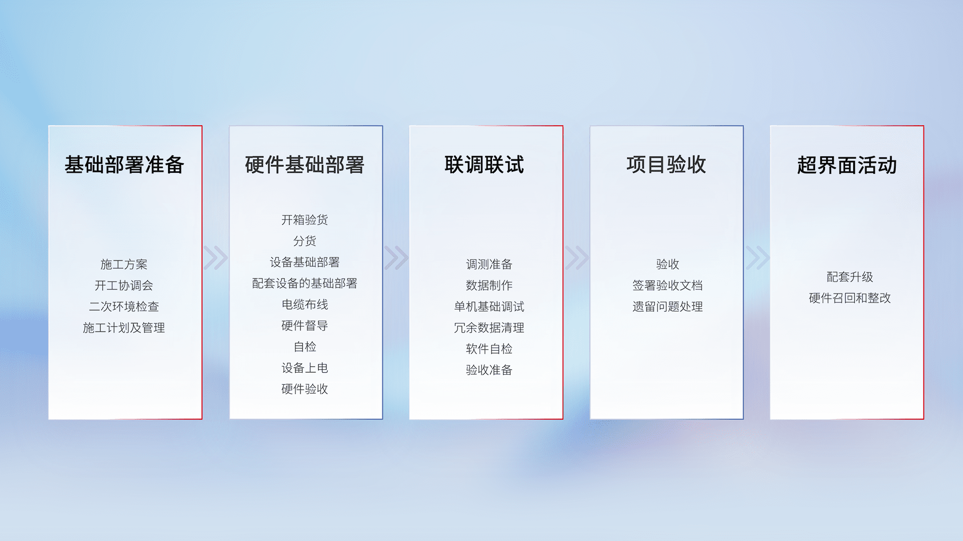 从基础部署准备、、、硬件基础部署、、联调联试、、、项目验收、、、越界面活动的全过程可追溯,,,保证施工质量和进度。。。